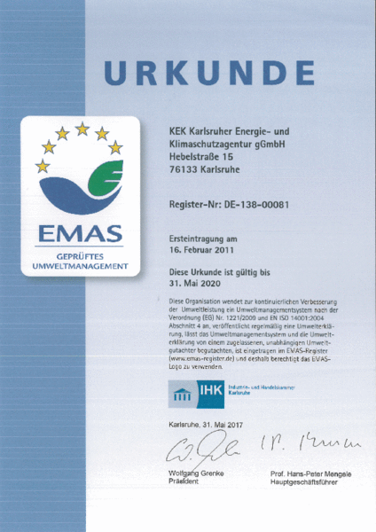 Seit 2010 besitzt die KEK ein Umweltmanagement-System nach der europäischen EMAS-Verordnung (Eco Management and Audit Scheme). Damit hat die KEK einen weiteren wesentlichen Schritt in Richtung Nachhaltigkeit vollzogen und sich mit ihren Umweltleitlinien ehrgeizige Ziele für die kommenden Jahre gesetzt.